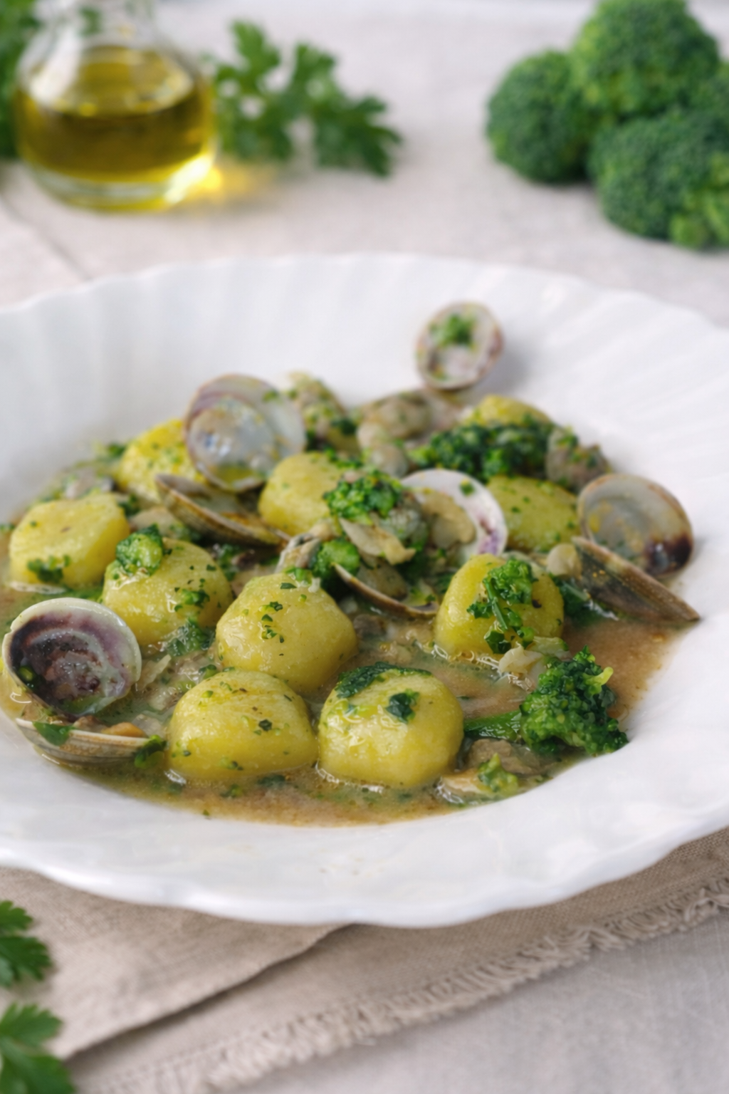 Gnocchi di patate con broccoli e vongole, serviti su una delicata cremina di pane di segale, un piatto elegante, equilibrato…